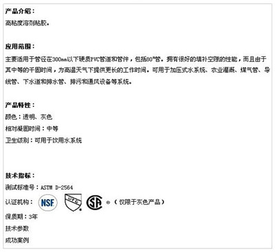 1、存放于40。F(5。C)到110。F(44。C)之間。僅用于PVC塑膠產(chǎn)品。使用前先攪勻,如成膠狀則不可使用。