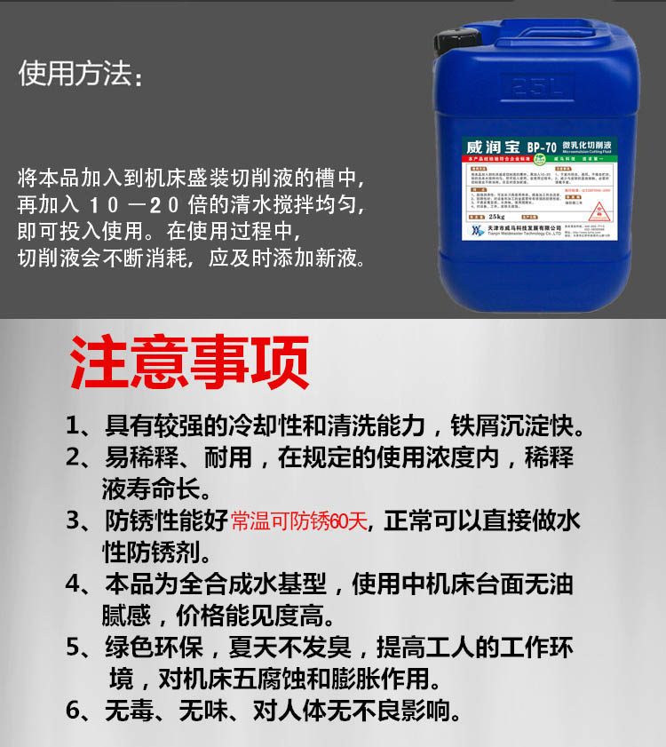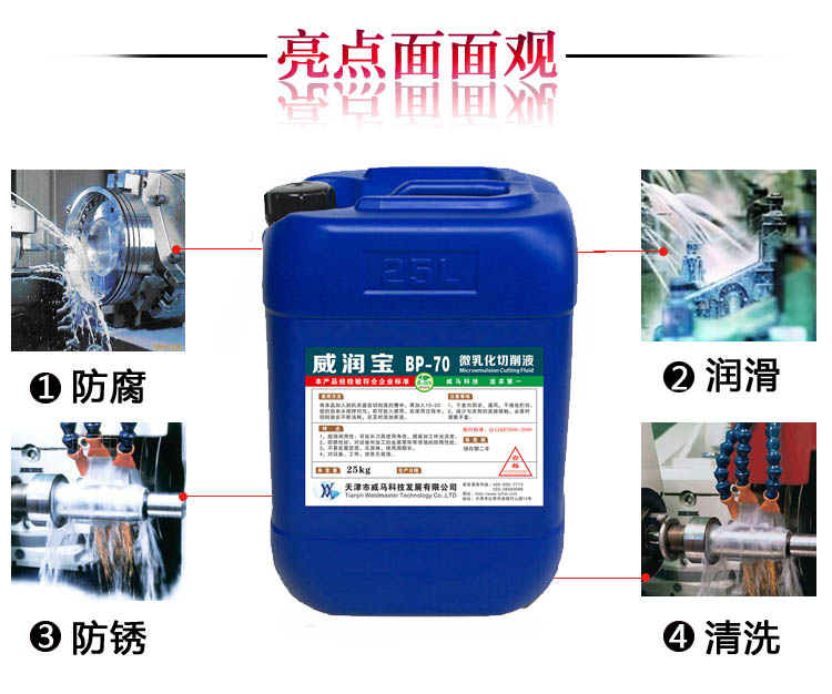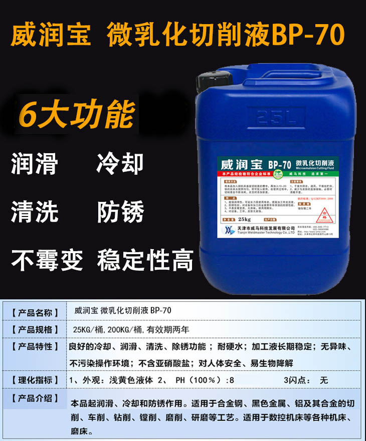威潤寶 微乳化切削液BP-70適用于生產(chǎn)機械加工過程中各類數(shù)控機床使用的切削液,潤滑、冷卻性能優(yōu)良,不霉變,穩(wěn)定性高,經(jīng)權(quán)威部門鑒定,本產(chǎn)品可以替代進口產(chǎn)品。