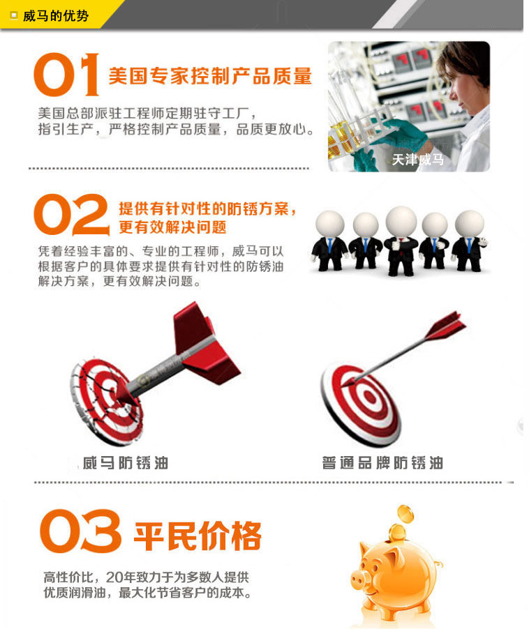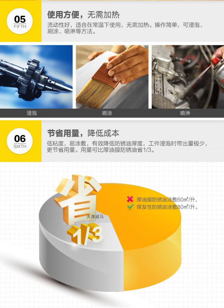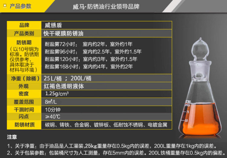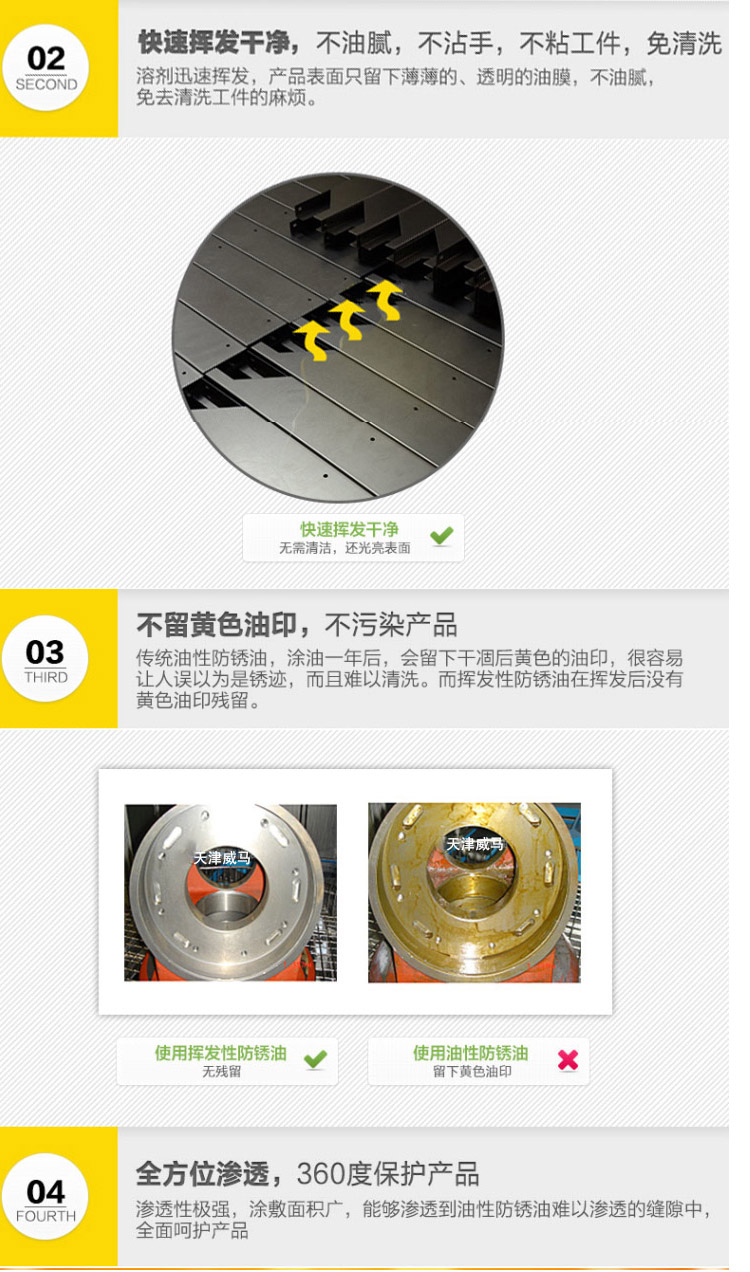 威銹盾EP-08硬膜防銹油是一種無(wú)色透明低粘度液體防銹專(zhuān)用品,以樹(shù)脂為成膜材料,加入高分子防銹添加劑并用精致石油溶劑配成的防銹油。本品在金屬表面成膜迅速、油膜堅(jiān)固、透明而均勻,決不沾手,有良好的耐磨耐熱性能,防銹時(shí)間持久??稍诟鞣N環(huán)境下長(zhǎng)期保存不銹蝕。本品使用簡(jiǎn)便,設(shè)備簡(jiǎn)單,刷、浸、噴均可,不遮蓋器件原色,并有增光作用。EP-08硬膜防銹油為本公司的招牌產(chǎn)品,公司引進(jìn)國(guó)外先進(jìn)專(zhuān)利配方和生產(chǎn)工藝,研制開(kāi)發(fā)出的新一代硬膜防銹油。經(jīng)測(cè)試,可以替代進(jìn)口同類(lèi)產(chǎn)品,歡迎測(cè)試,選購(gòu)。